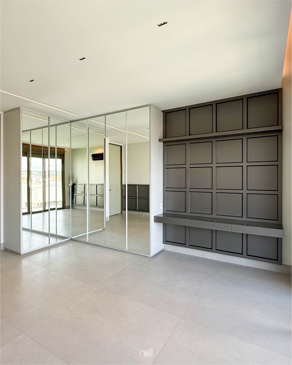 O uso da frente em espelho amplia a sensação de espaço, enquanto o boiserie em laca agrega aconchego e elegância.