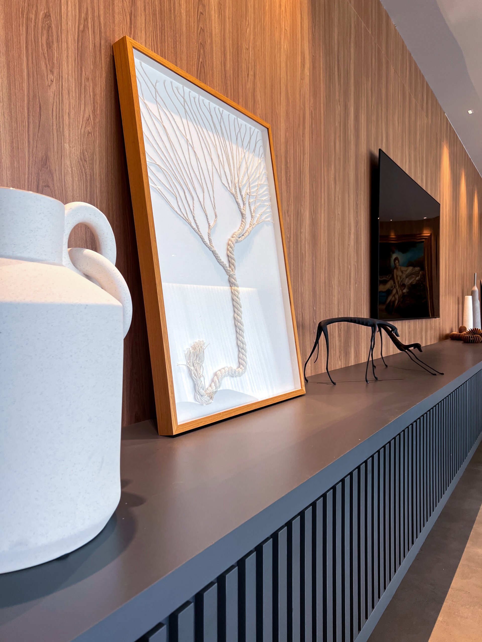 O contraste entre a lâmina natural e a laca cria equilíbrio entre o rústico e o sofisticado.